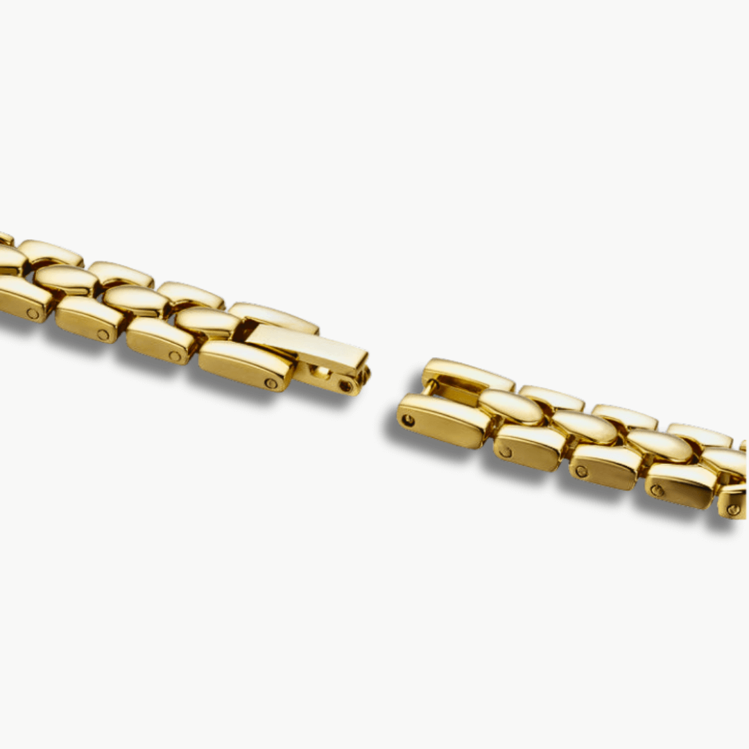 - Bracelet: Gold-plated alloy, adjustable
