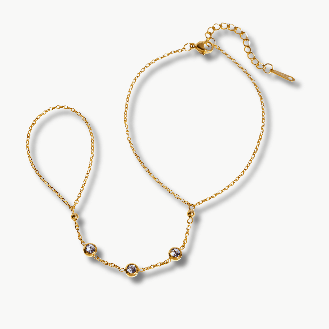 Gracefully minimal, this piece captures a quiet sparkle with vintage style. Its fine gold hand chain and delicate stones feel like a old money elegance.