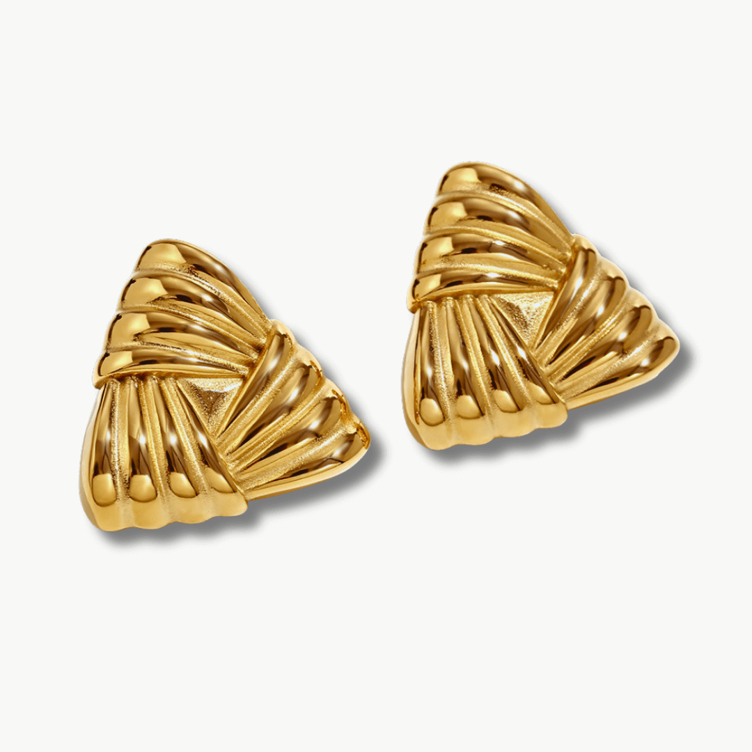 The Clio earrings feature a bold triangular silhouette with a sculpted, fan-like texture that radiates outward in fluid golden lines. Their dimensional surface reflects light beautifully, making them a standout accessory that blends vintage inspiration with contemporary edge. Ideal for dressing up minimalist or structured looks.