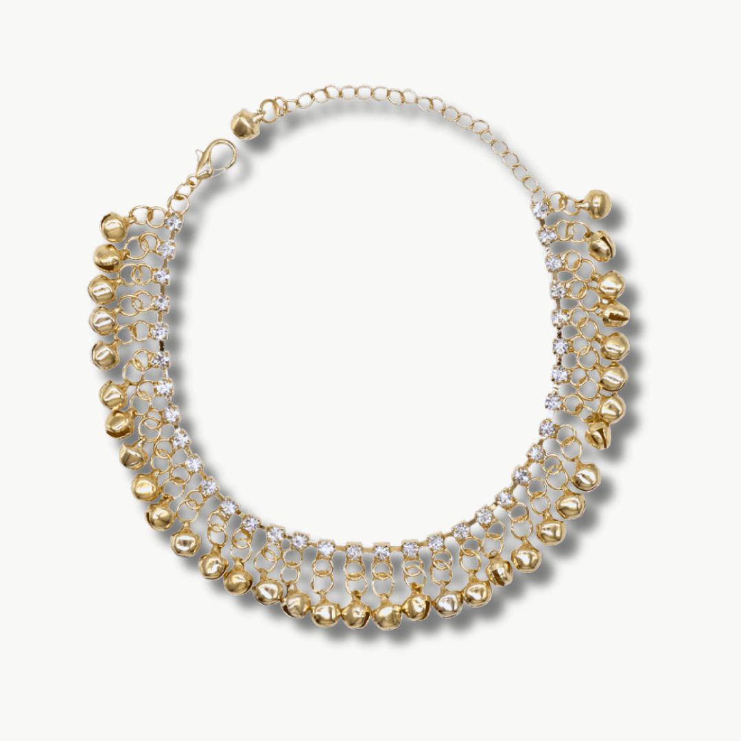 A radiant gold anklet adorned with clustered bell charms and shimmering crystal accents. Mehira embodies old money elegance and rhythmic movement, evoking a festive charm.