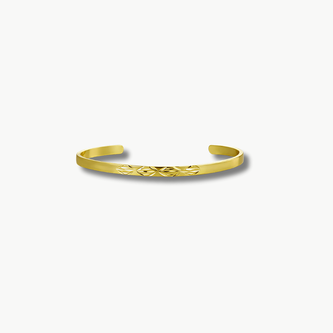 A sleek, open cuff adorned with finely etched geometric patterns. A balanced blend of simplicity and detail, this piece brings a vintage vybes