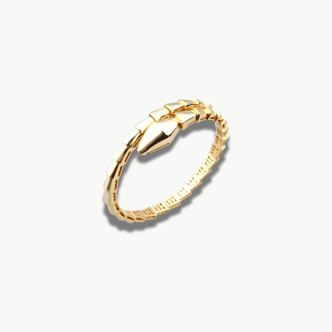A sleek, snake-inspired gold ring featuring flexible, scaled segments that form a continuous loop. Its fluid silhouette symbolizes old money era and strength, making it a striking accessory for both minimalists and bold dressers.