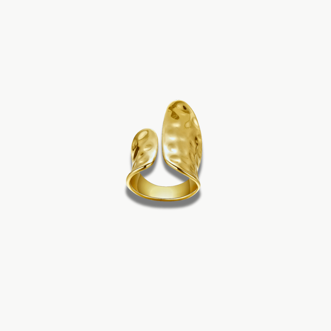 A sculptural open ring with a fluid, asymmetrical form that mimics the movement of water. Its hammered texture adds a touch of old money elegance and modern artistry.